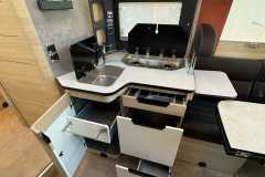 Zlew i dwupalnikowa kuchenka na eleganckim blacie z przedłużeniem blatu roboczego