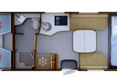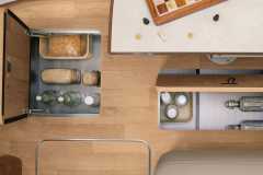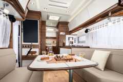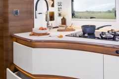 Elektrozawór do zrzutu wody szarej, prysznic zewnętrzny w garażu z mikserem wody ciepła/zimna po stronie pasażera, elektrozawór wbudowany w reduktorze GOK razem z systemem Crashsensor, świetlik Midi Heki 700x500 nad salonką, świetlik Mini Heki 400x400 nad opuszczanym łóżkiem przednim, drzwi zabudowy z wbudowanym koszem, podwójnym ryglowaniem i moskitierą, centralny zamek drzwi szoferki i zabudowy, podgrzewany zbiornik na wodę szarą, sufit tapicerowany w całości zabudowy, podgrzewany schowek na buty przy wejściu, odkurzacz stacjonarny pod lodówką, zasilany 230V, dodatkowe lampki z wbudowanymi ładowarkami USB, wbudowany okap kuchenny z oświetleniem LED, podgrzewane i elektrycznie regulowane lusterka boczne szerokokątne, podgrzewana szyba przednia, elektrycznie regulowana roleta szyby przedniej, zbiornik wyrównawczy ciśnienie przy pompce wody.